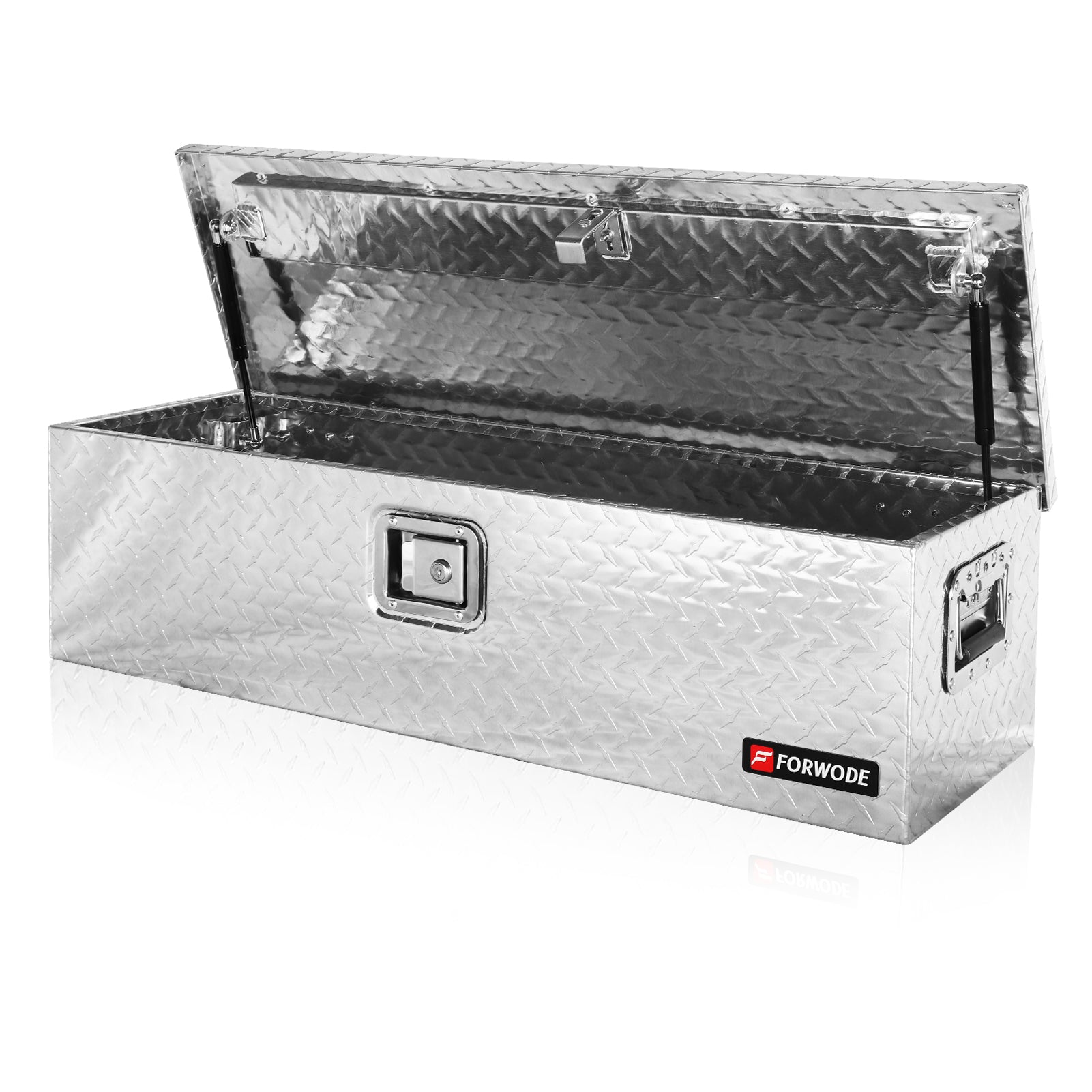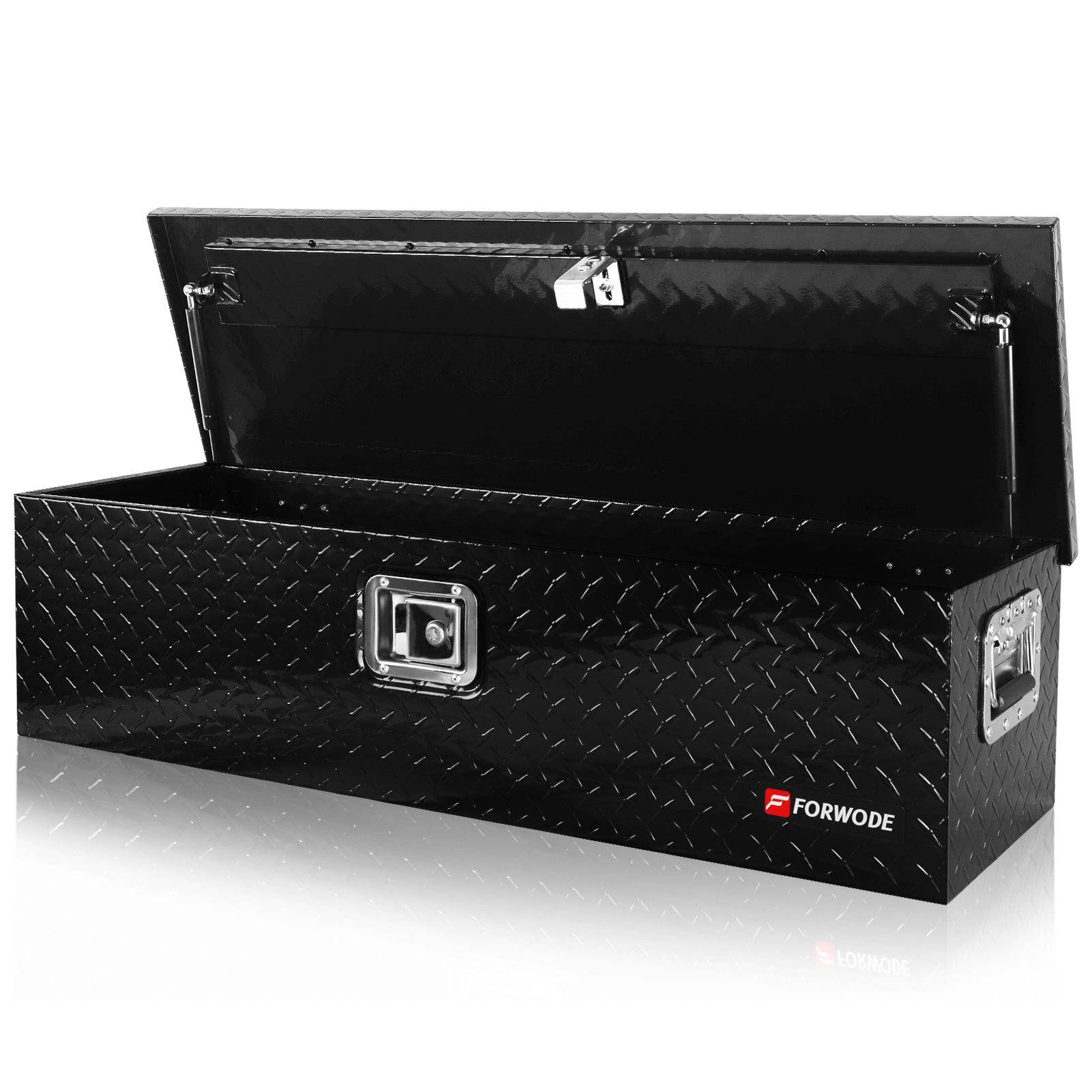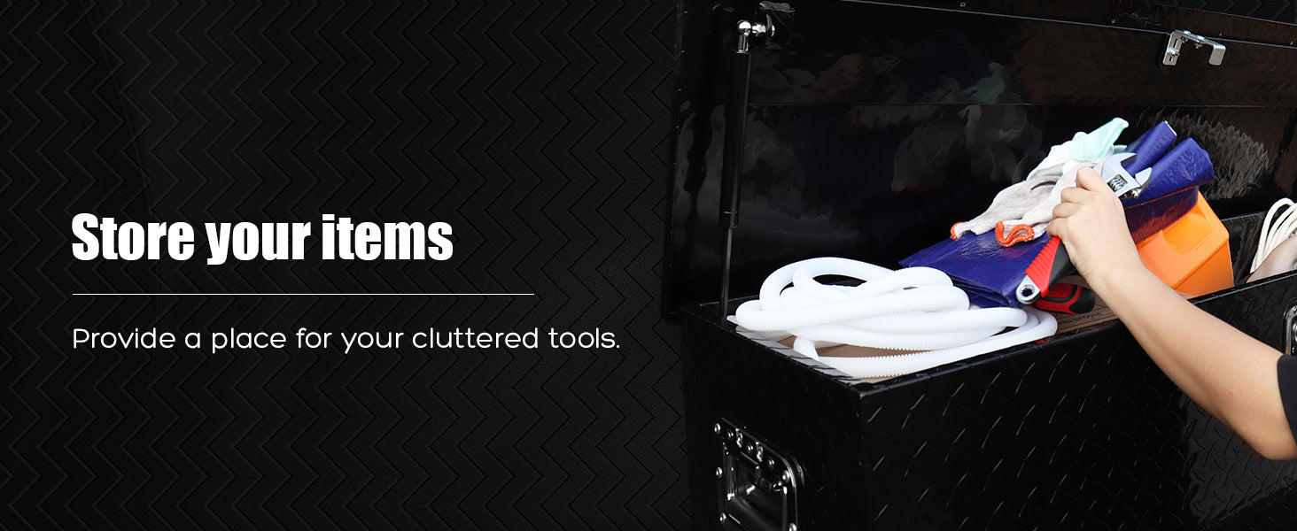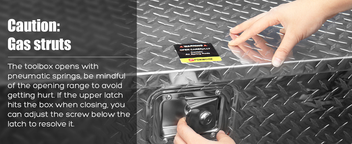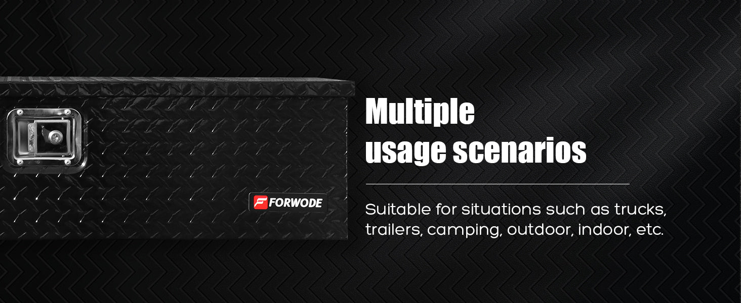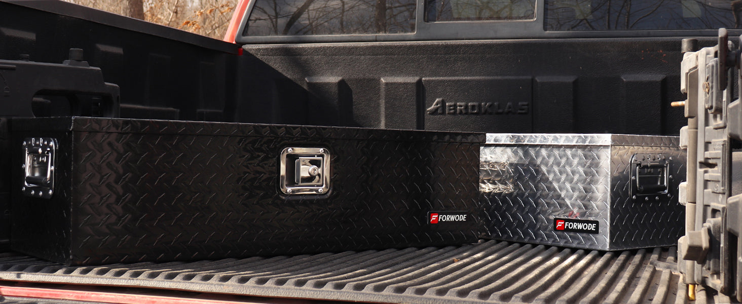FORWODE aluminum tool box for truck bed boasts a simple yet vintage design, offering a lightweight and durable storage solution. When the doors are closed, it prevents moisture or water from entering, protecting your tools from harsh weather conditions. The top-opening lid provides easy access to your toolbox's contents and allows for convenient organization. The gas strut design ensures a stable lid-opening process. Equipped with side handles, this trailer tongue box offers a secure grip even when wearing gloves, making it easy to transport.