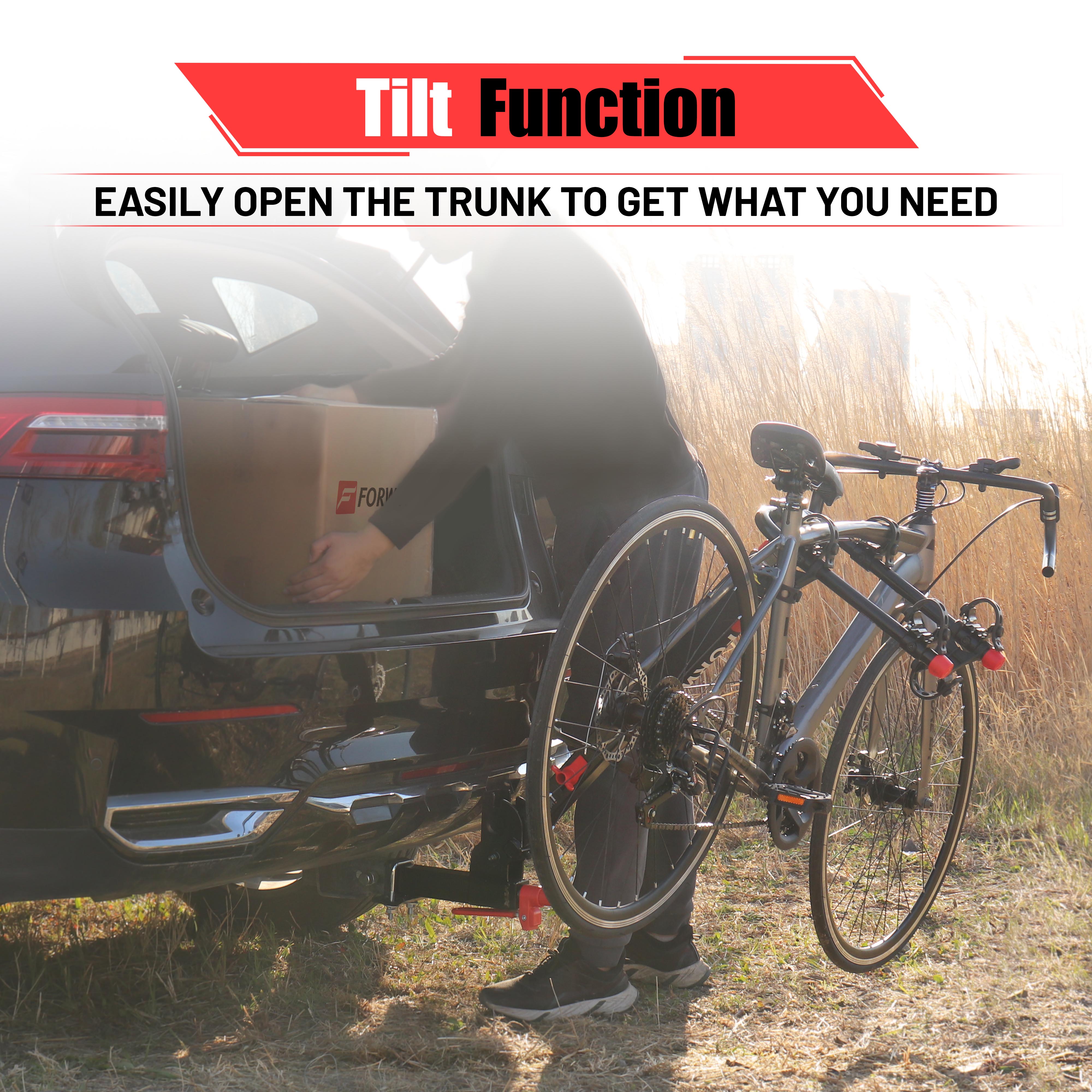 FORWODE PREMIUM hitch mount bike rack is constructed with corrosion-resistant, all-steel construction, making it durable and powerful enough to carry 2 bikes weighing 35 lbs each. (70 lbs total). The arms fold up and down with ease for quick storage and easy loading. A quick-release tilt lever provides easy access to your vehicle's rear cargo area, no bike unloading is required