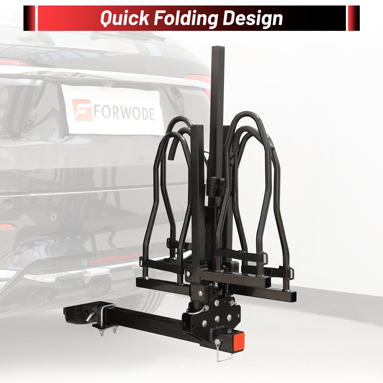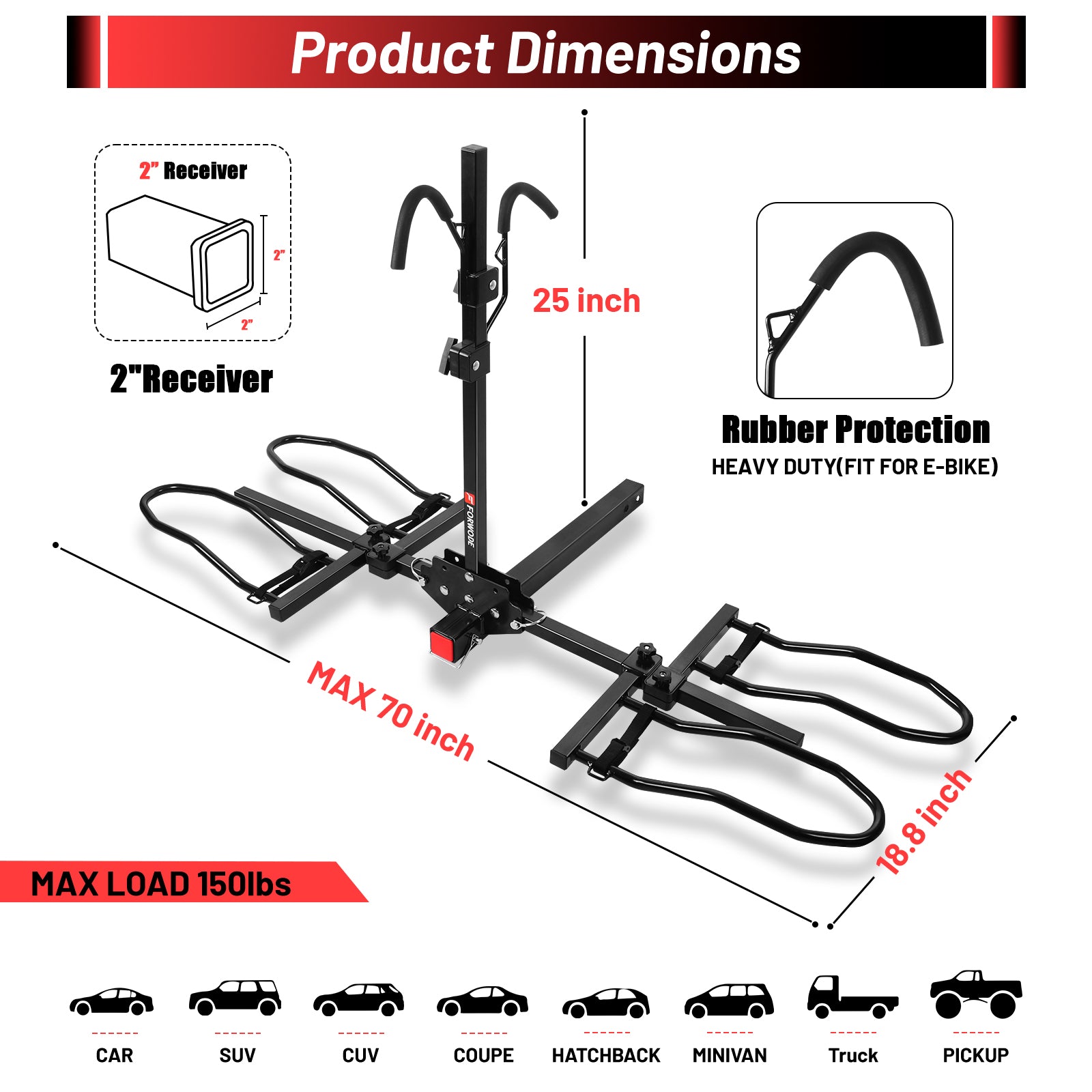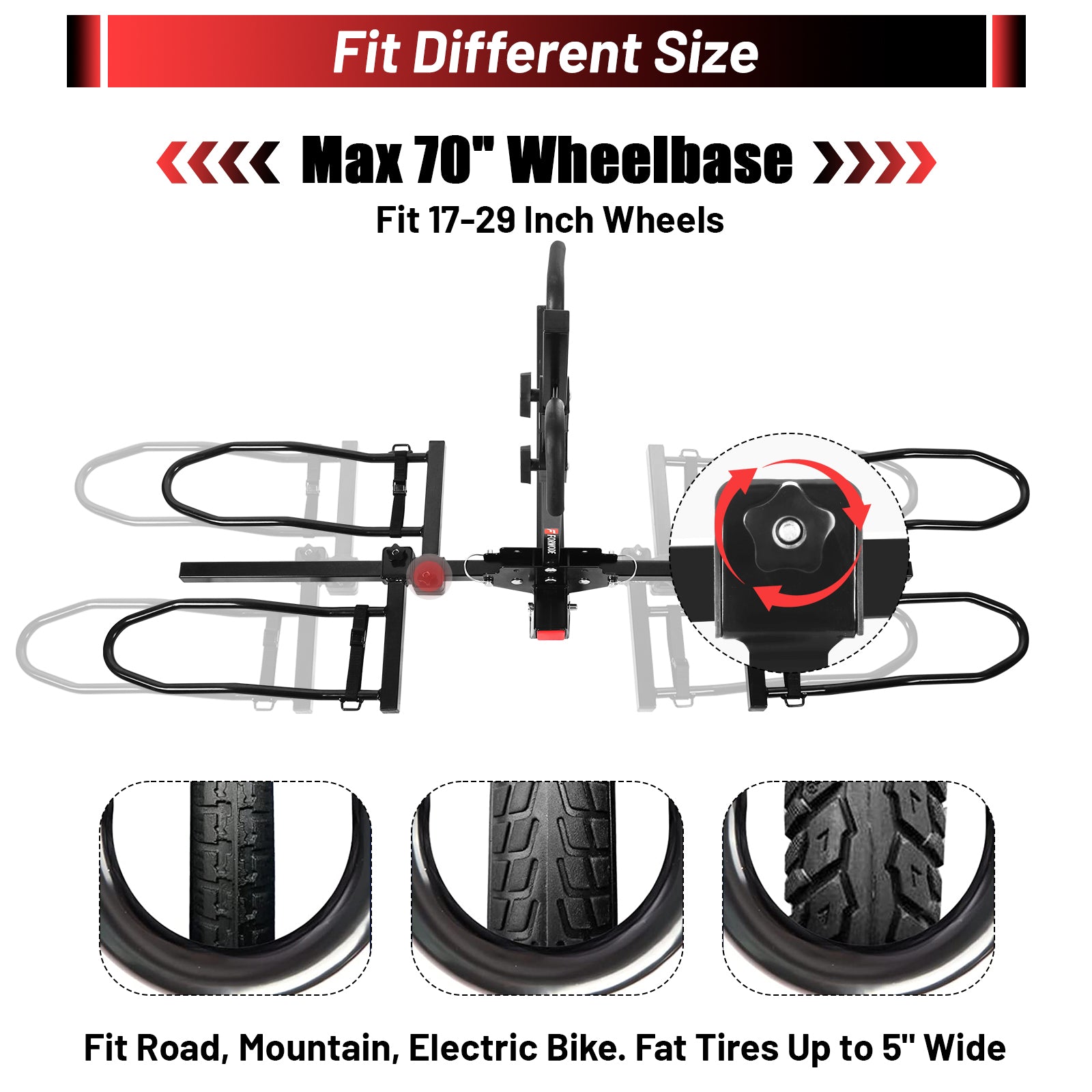 FORWODE Function hitch mount bike rack is constructed with corrosion-resistant, all-steel construction, making it durable and powerful enough to carry 2 bikes weighing 80 lbs each. (160 lbs total). The bike rack fit 17-29 inch wheels, max 70inch wheelbase, and up to 5-inch tires