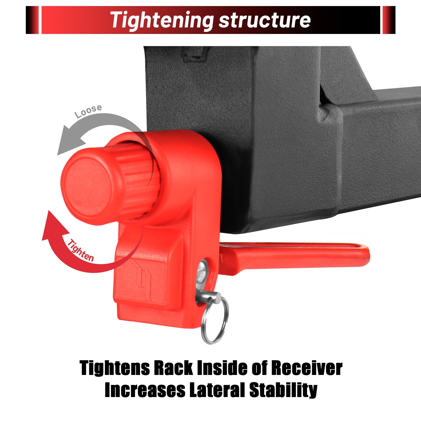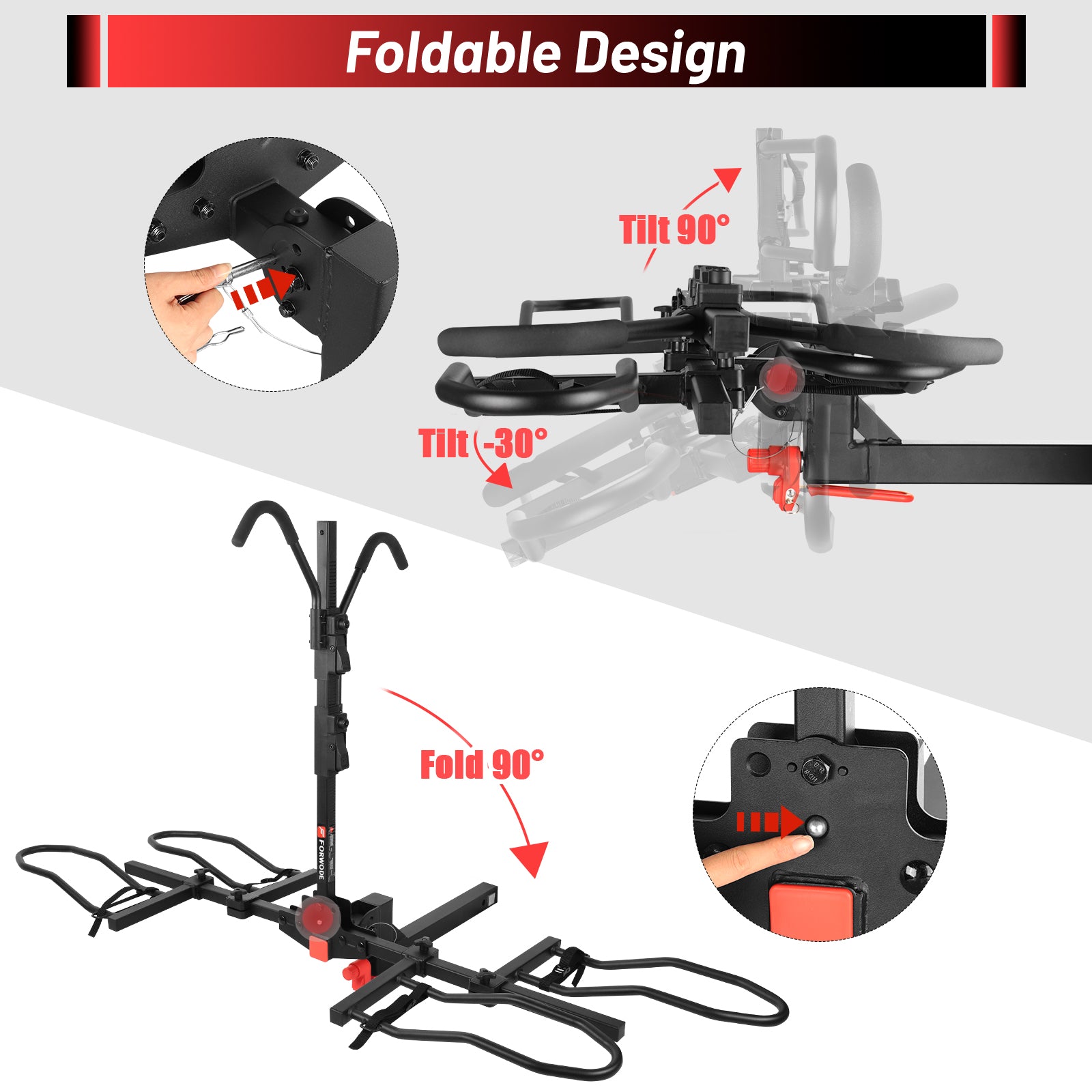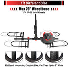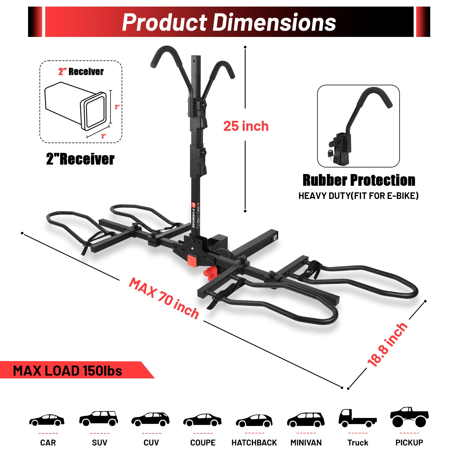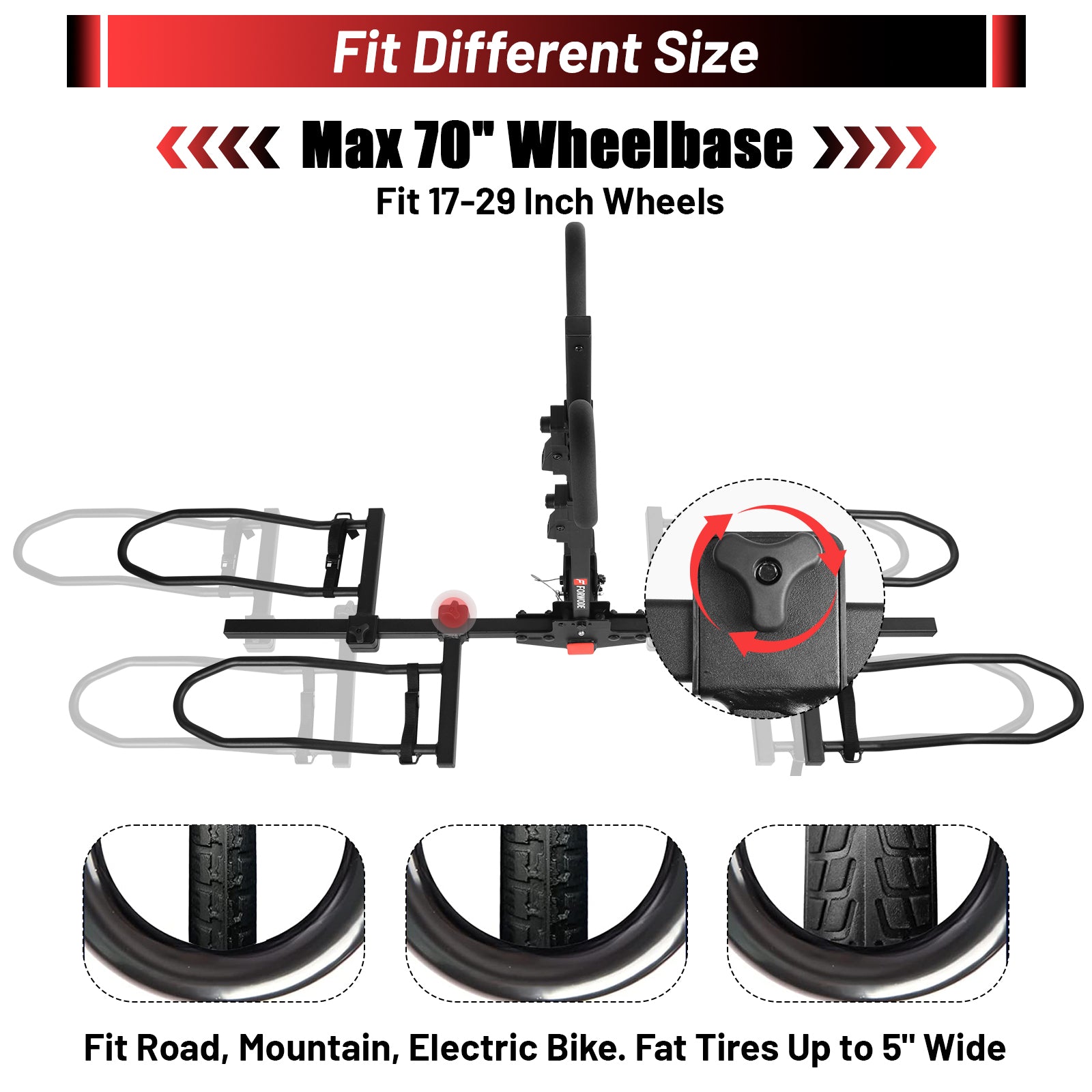 FORWODE Intermediate hitch mount bike rack is constructed with corrosion-resistant, all-steel construction, making it durable and powerful enough to carry 2 bikes weighing 90 lbs each. (180 lbs total). The bike rack fit 17-29 inch wheels, max 70inch wheelbase, and up to 5-inch tires
