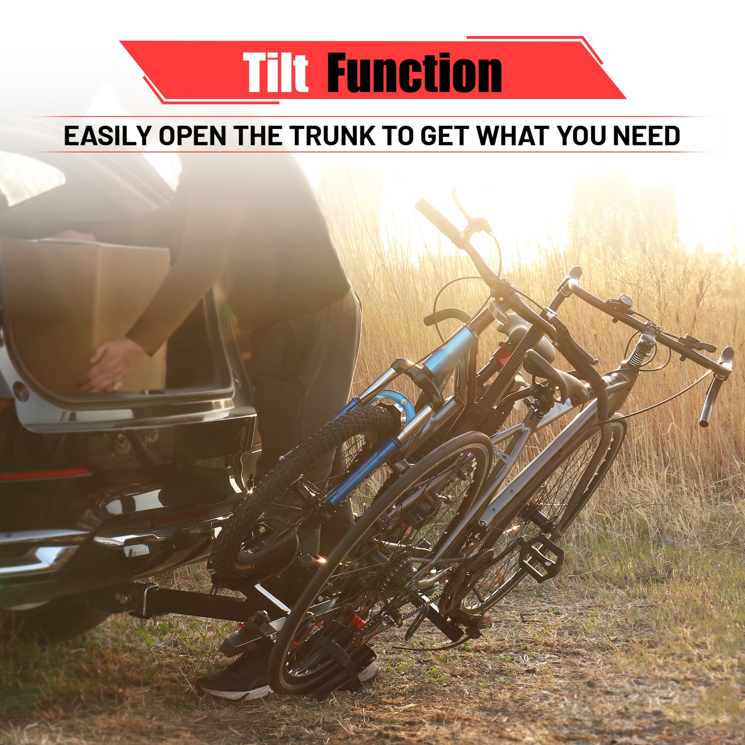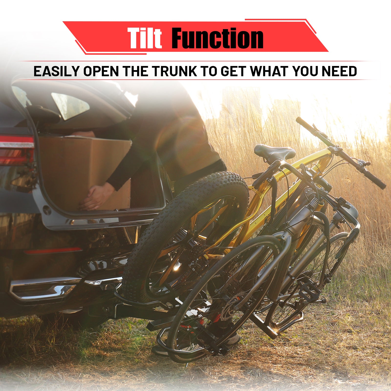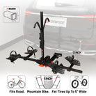 FORWODE PREMIUM hitch mount bike rack is constructed with corrosion-resistant, all-steel construction, making it durable and powerful enough to carry 2 bikes weighing 90 lbs each. (180 lbs total). The bike rack fit 17-29 inch wheels, max 70inch wheelbase, and up to 5-inch tires
