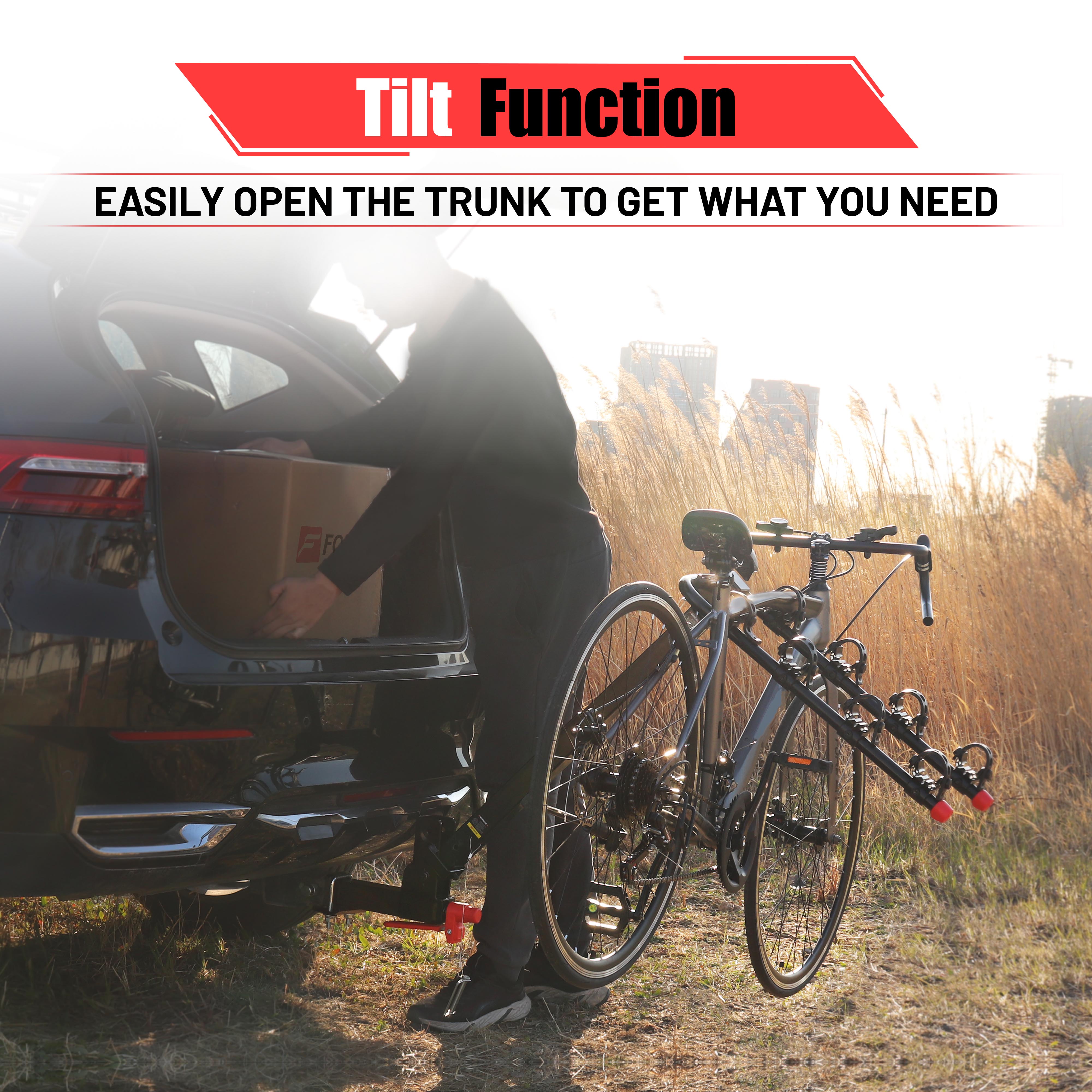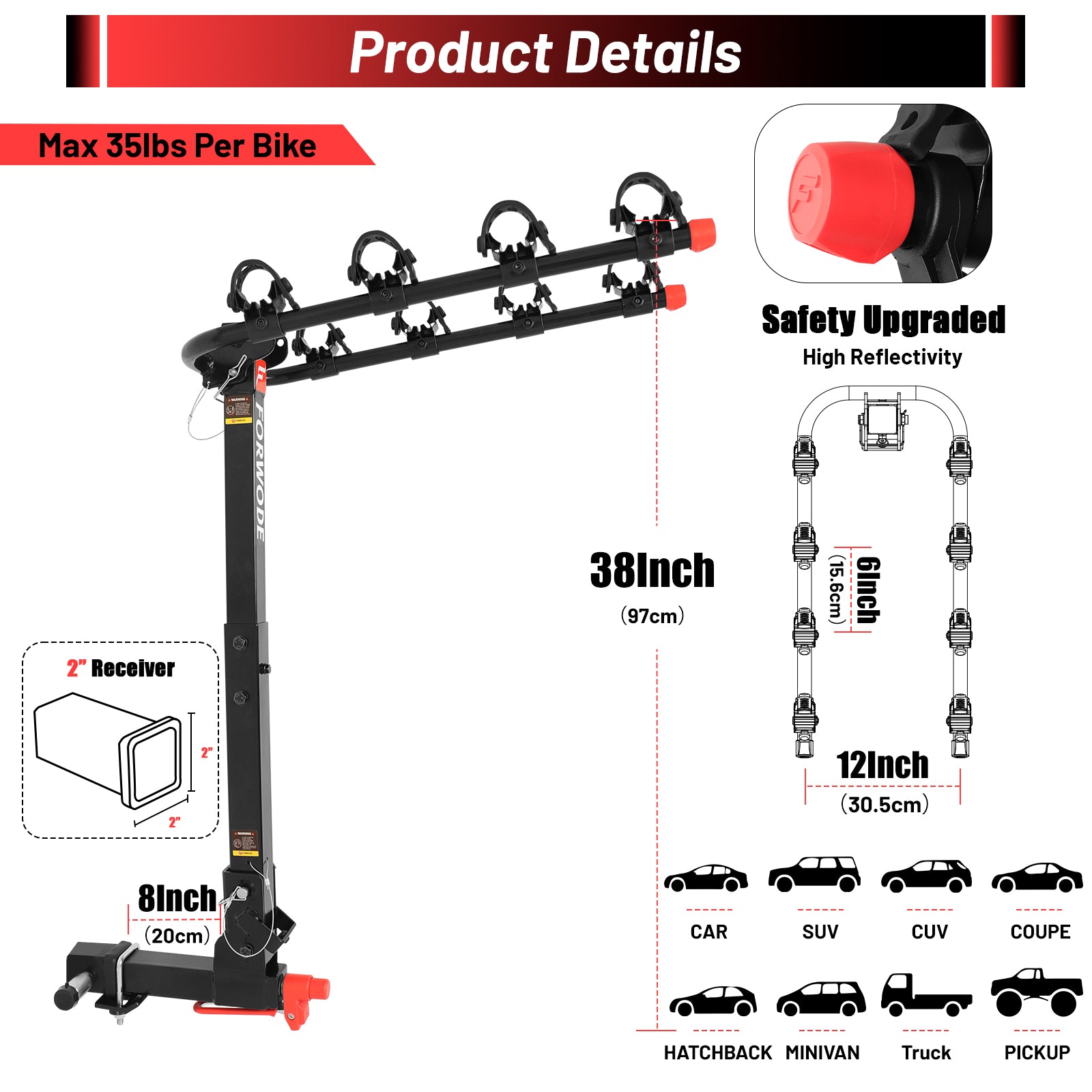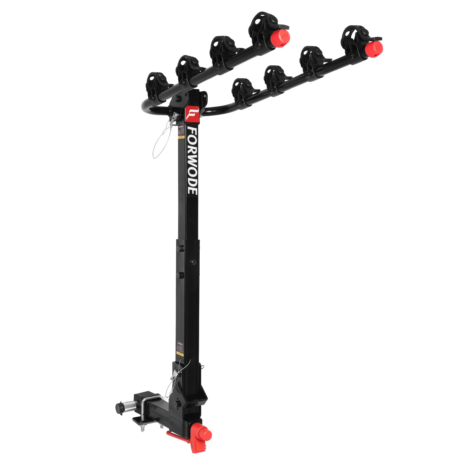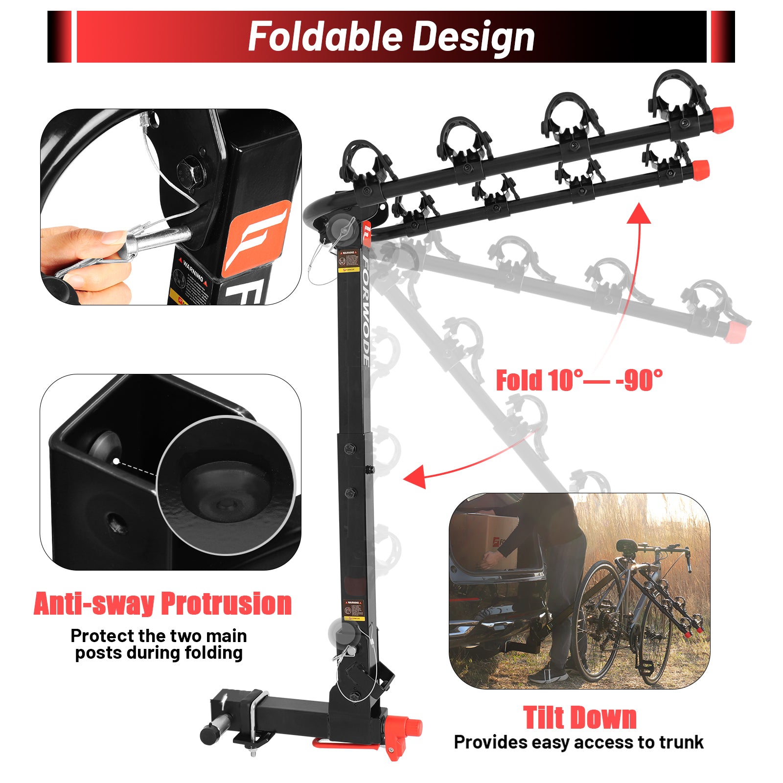 FORWODE UPGRADE hitch mount bike rack is constructed with corrosion-resistant, all-steel construction, making it durable and powerful enough to carry 4 bikes weighing 35 lbs each. (140 lbs total). The arms fold up and down with ease for quick storage and easy loading. A quick-release tilt lever provides easy access to your vehicle's rear cargo area, no bike unloading is required